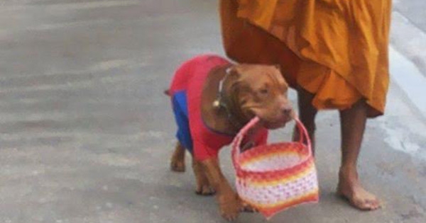 น่ารักมาก ! พิทบูลแสนรู้ เดินบิณฑบาตพร้อมพระ อย่างกับเด็กวัด