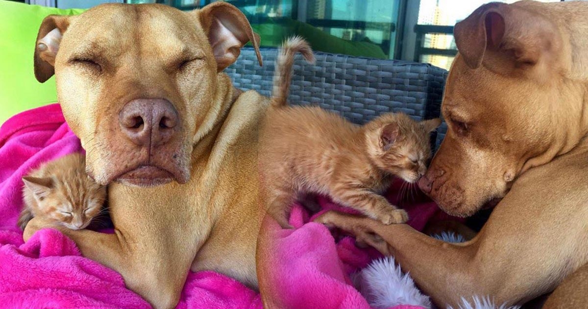 น่ารัก สุนัขพิทบูลแสนอ่อนโยนเลี้ยงเหมียวน้อยเหมือนลูก ทะนุถนอมสุด ๆ เลย