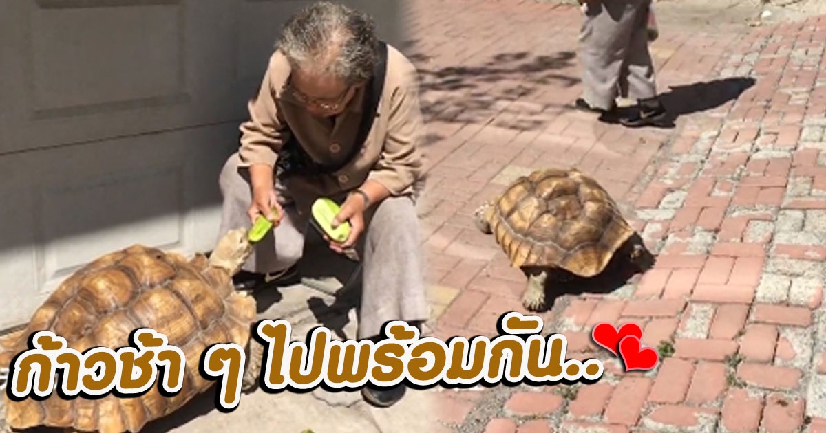 คุณยายพาเต่ายักษ์ลูกรัก หนักกว่า 50 กก. ไปเดินเล่นทุกวัน ก้าวช้า ๆ ไปพร้อมกัน
