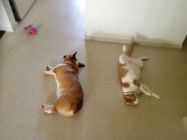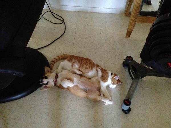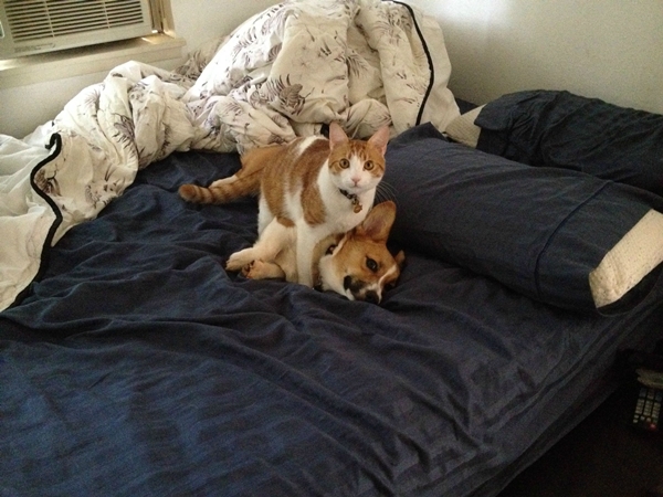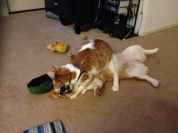 เรามักเข้าใจว่า หมาและแมว เป็นคู่กัดกันมาตั้งแต่ชาติปางก่อน เพราะเห็นทีไรก็คอยจ้องแต่จะแยกเขี้ยว ตะปบกรงเล็บ ใส่กันทุกที แต่สำหรับ น้องหมาคอร์กี้ และเจ้าแมวเหมียวตัวนี้ กลับเป็นเพื่อนซี้ที่ใช้ชีวิตอยู่ด้วยกันแบบชิล ๆ ไม่มีทะเลาะตบตีกันให้เห็น แถมยังคอยกอดให้กำลังใจกันจนดูเหมือนคู่รักกันซะด้วย !