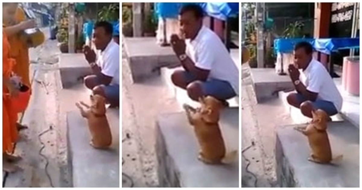 โดยในคลิปจะเห็นชายคนหนึ่งได้ตักบาตรพระ และก้มลงไปนั่งรับพร โดยมีสุนัขสีน้ำตาลตัวน้อยนั่งอยู่ข้าง ๆ และเมื่อพระเริ่มให้พร เจ้าสุนัขตัวนี้ก็พยายามยืนสองขา และทำท่าคล้ายกับกำลังพนมมือเพื่อรับพรตามอย่างเจ้านายของมันซะนี่ จนเณรที่มาบิณฑบาตด้วยกันยังอดเข้าไปเล่นกับเจ้าหมาน้อยไม่ได้