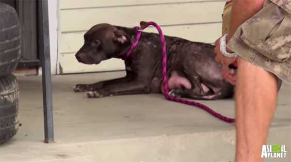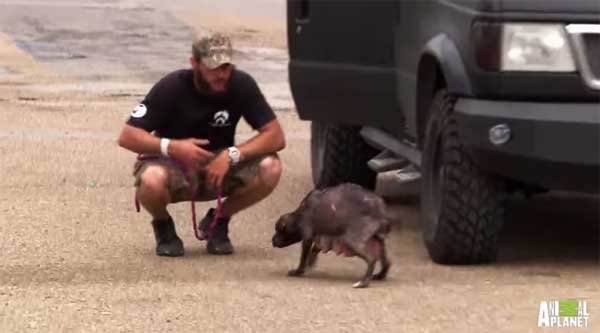 ทีมงานจอดรถและส่งเสียงเรียกมัน ซึ่งแม้ว่าจะดูยังกล้า ๆ กลัว ๆ แต่แม่สุนัขก็เดินตรงมายังทีมงาน และยอมให้พวกเขานำสายคล้องใส่ที่คอแต่โดยดี