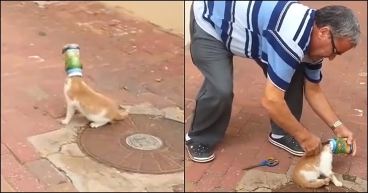 แมวน้อยหัวติดเข้าในกระป๋องแน่น ร้องขอความช่วยเหลือด้วยความทรมาน นับเป็นโชคดีของมันจริง ๆ ที่ชายใจดีคนนี้มาเจอและช่วยไว้ได้อย่างปลอดภัย