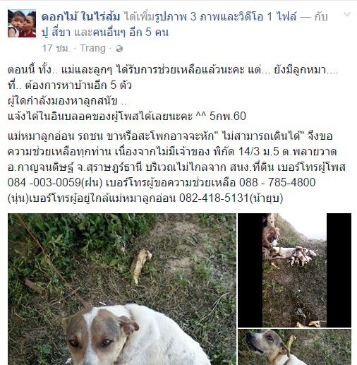 ทั้งนี้ คุณ Papanggron Kalapaha คือบุคคลที่ไปพบกับสุนัขตัวนี้ และเผยว่า สุนัขตัวนี้อยู่เลขที่ 14/3 ม.5