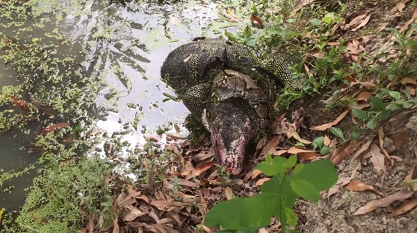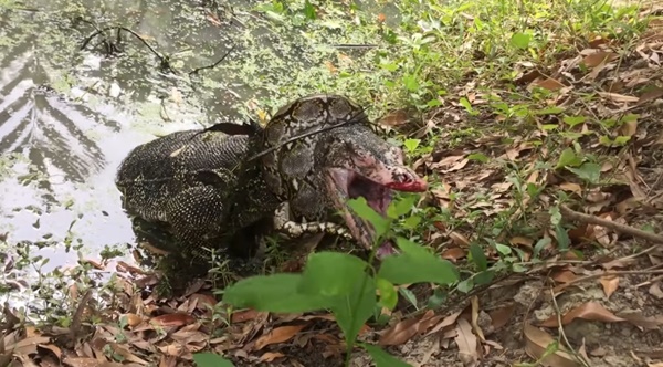 โดยที่ในตอนแรก ทั้งงูเหลือมและตัวเงินตัวทอง ต่างฟัดกันอย่างสูสีในน้ำ แต่เมื่อได้จังหวะ งูเหลือมจึงเข้ารัดตัวเงินตัวทองบริเวณลำคอ จนตัวเงินตัวทองต้องแน่นิ่ง อ้าปากหายใจพะงาบ ๆ เพื่อให้งูเหลือมตายใจว่ามันตายแล้ว จนเมื่อนิ่งแล้ว ตัวเงินตัวทองจึงดิ้นหนีไปได้