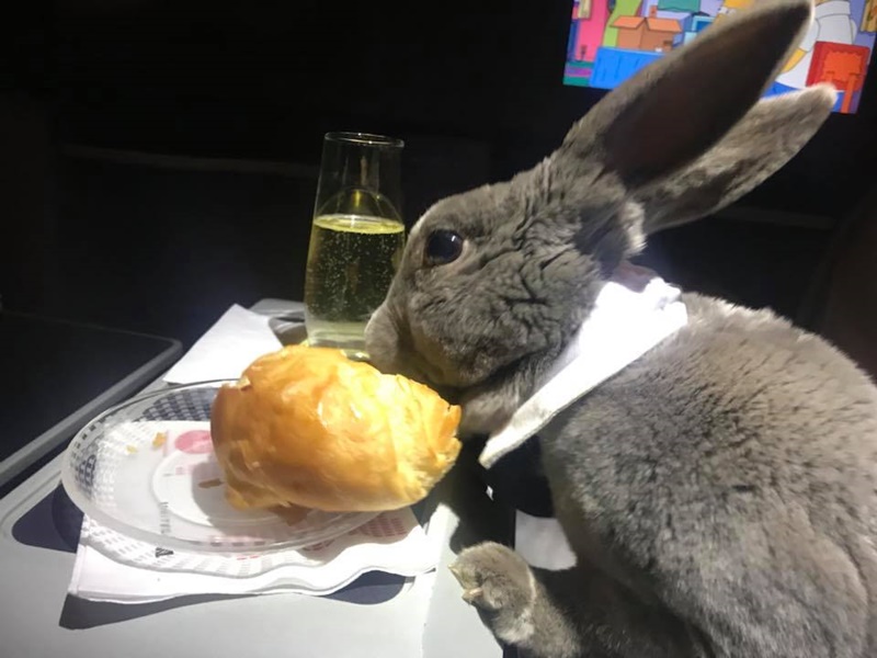 คุณกระต่าย Coco ผูกหูกระต่ายนั่งบนเบาะท่านผู้โดยสาร มีบริการเสิร์ฟแชมเปญและครัวซองต์ให้ถึงที่ ท่าทางของเจ้า Coco ก็ดูแฮปปี้สุด ๆ