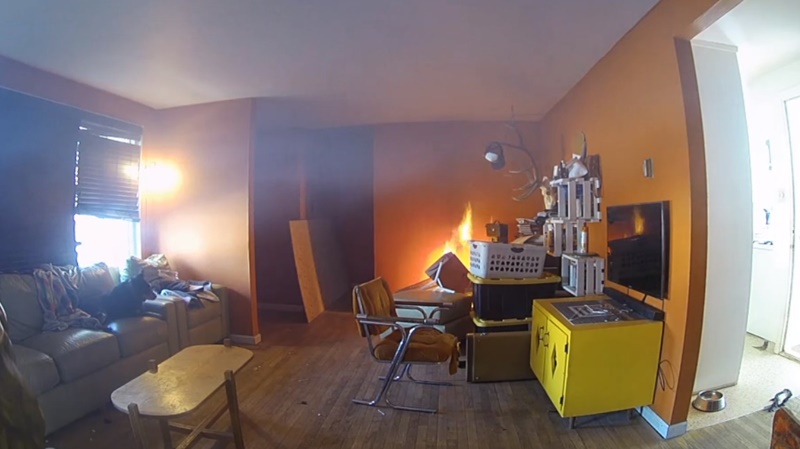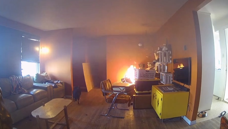คลิปเผยให้เห็นวีรกรรมของเจ้าคาฮูนา สุนัขวัย 9 เดือน เมื่อวันที่ 29 มกราคม ที่ผ่านมา มันซนจนทำให้โต๊ะรีดผ้าและข้าวของบนนั้น ไปตกใส่ตะแกรงเครื่องทำความร้อนที่ตรงพื้นมุมบ้าน หลังจากนั้นไม่นาน วัสดุบางอย่างก็ลุกติดไฟ เกิดเป็นเพลิงไหม้ขึ้น