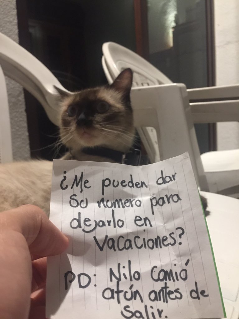 - หลังจากนั้น เมื่อเจ้านีโลจะออกเดินทางอีกครั้ง เฮคเตอร์ก็เลยเขียนโน้ตกลับไป บอกว่า "ขอเบอร์ติดต่อของคุณได้ไหม เราจะได้สบายใจกันว่ามันถึงบ้านปลอดภัย หรือไปเที่ยวเล่นอยู่ที่ไหน ป.ล. เจ้านีโลเพิ่งกินทูน่าก่อนออกไป"