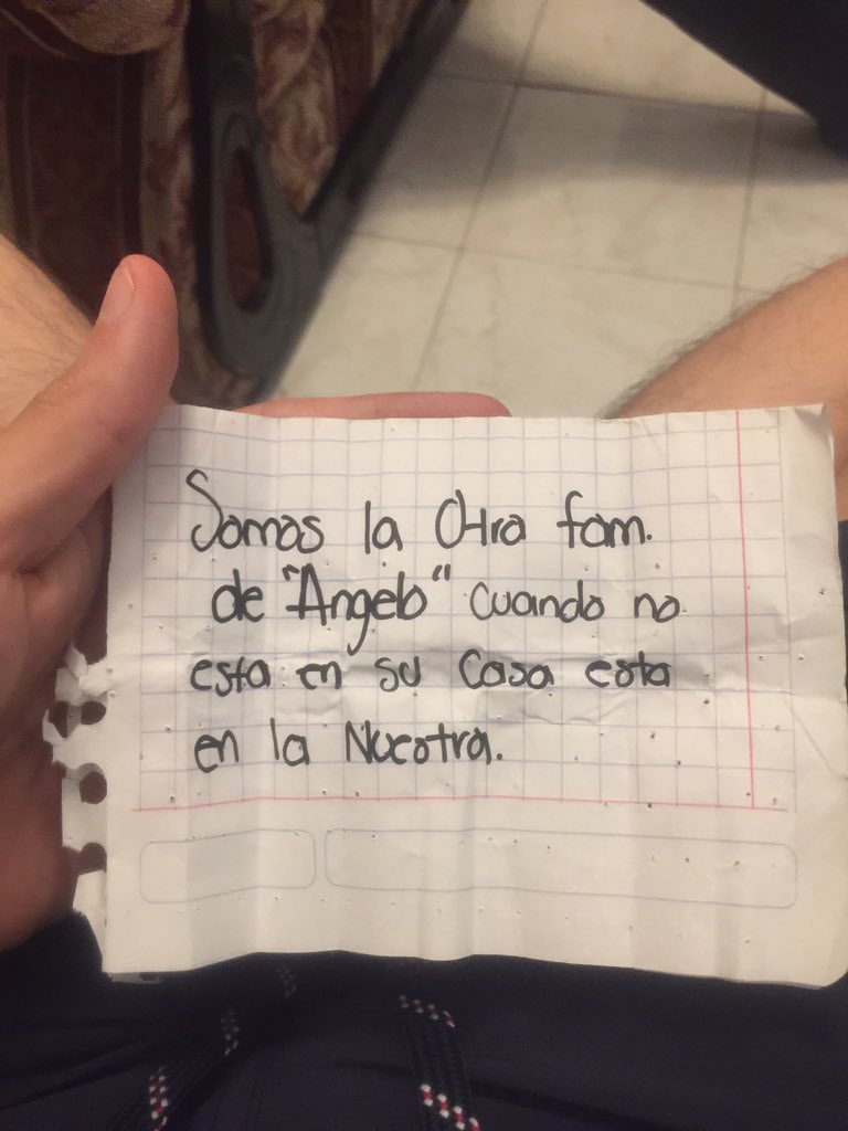 - "พวกเราเป็นครอบครัวของเจ้าแองเจโล ตอนที่มันไม่ได้อยู่บ้านคุณ มันอยู่กับพวกเรา" ข้อความที่ระบุในกระดาษโน้ต
