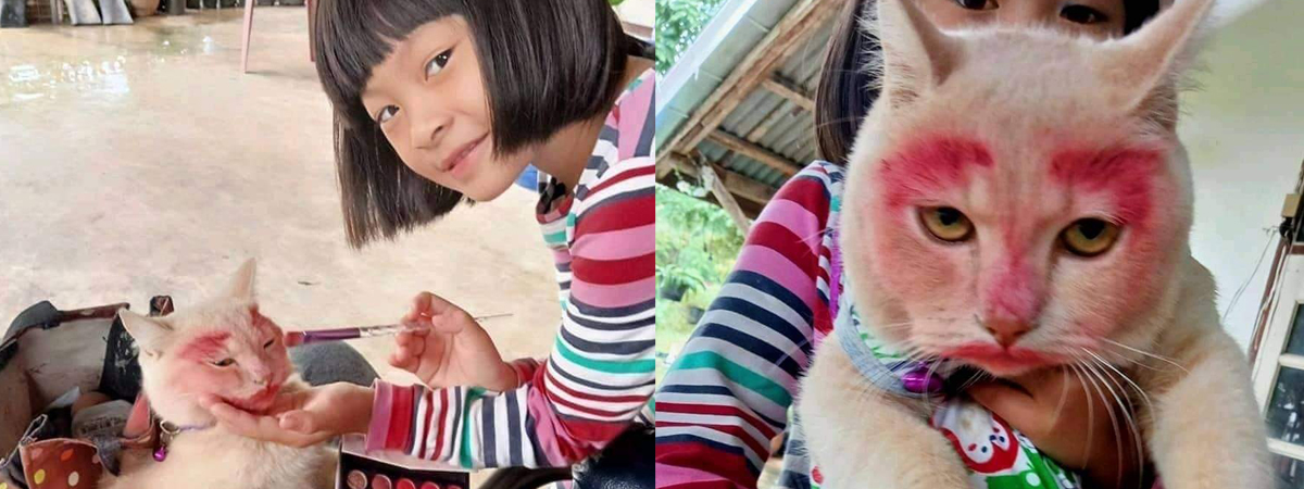 เฟซบุ๊กคุณ Uza ได้เผยภาพของเจ้าเหมียวตัวหนึ่ง ถูกเป็นแบบแต่งหน้าให้กับสาวน้อยคนนี้ ละเลงเครื่องสำอางบนหน้าแบบจัดเต็ม จนสีแดงเต็มทั่วหน้า เห็นแล้วไม่รู้จะขำหรือสงสารเจ้าแมวเลยจริง ๆ เหมือนเอามาแกงยังไงก็ไม่รู้